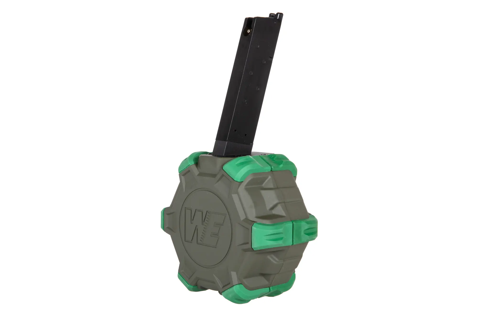 De drummag voor 1911 WE replicas biedt een revolutionaire oplossing voor airsoft spelers die op zoek zijn naar een hoge capaciteit en betrouwbare prestaties. Met een indrukwekkende capaciteit van 350 BB’s en een slim ontwerp combineert dit magazine functionaliteit met gebruiksgemak. Gemaakt van een combinatie van duurzaam kunststof en metaal, en ontworpen in een stijlvolle groene kleur, is deze drummag een perfecte keuze voor intensieve airsoft-gevechten.